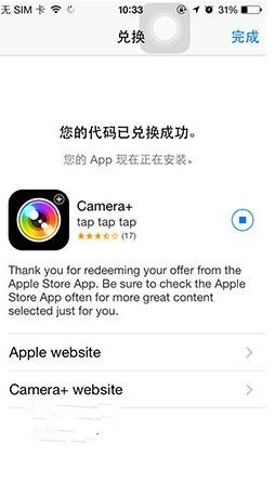 下载好Apple Store后,点击零售店,就会看到“终极相机App”,点击它转入App Store,领取兑换码后直接点击兑换即可下载。
