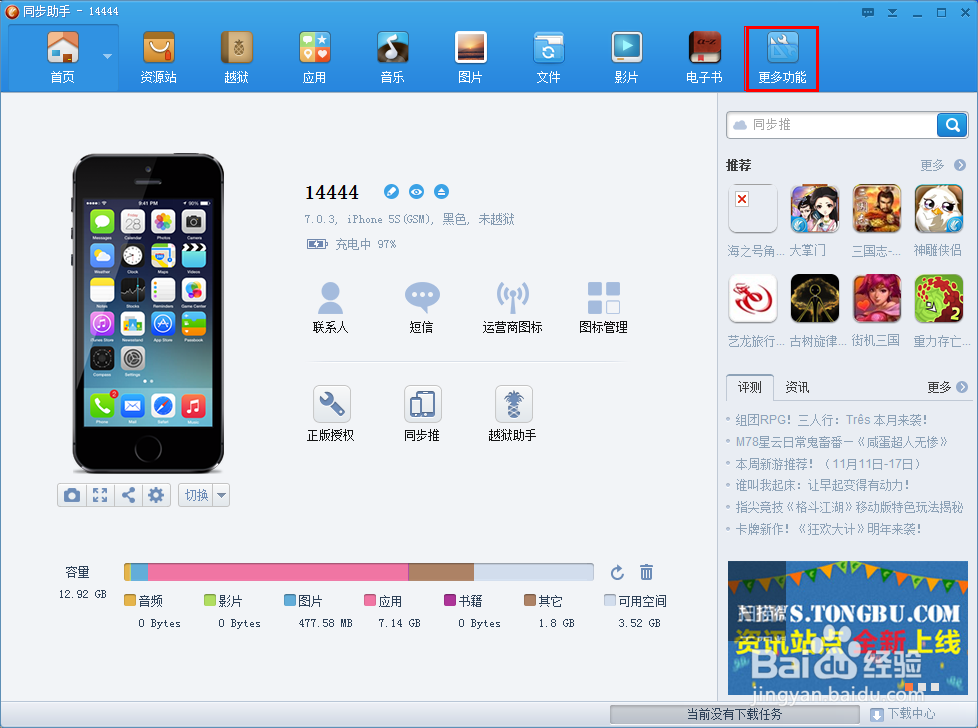 看到好多人都在问,怎么把iphone手机里的短信导出来,itunes又不行。想保存到电脑上。今天我就教大家一下,其实非常简单,只要用同步助手把短信导出就行了,嗯哼~同步助手相信大家都有用,没有的自己去百度下就好了。第一步,手机连接电脑,打开同步助手如图: