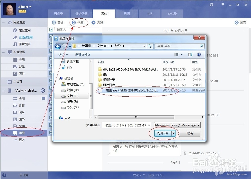 一、将要恢复短信的手机连接电脑端的PP助手,点击设备栏下方的【信息】--【短信】,点击恢复按钮,在弹出来的新窗口中选择之前备份好的短信文件。