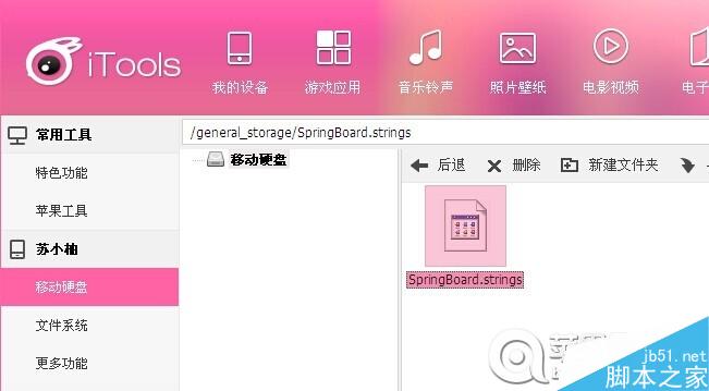 打开你的itools,利用itools的移动硬盘功能,将导出的SpringBoard.strings文件导入进itools的“移动硬盘”内,双击打开。