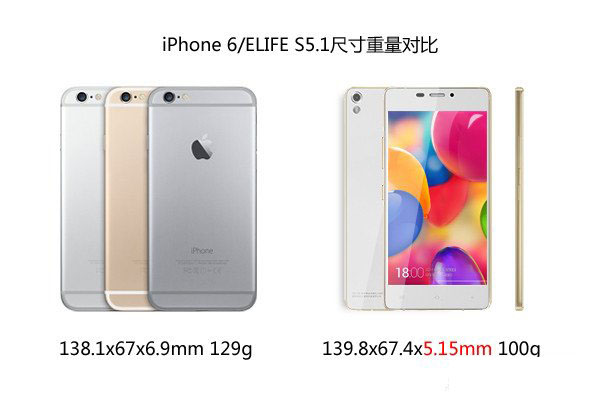 iPhone 6和ELIFE S5.1在轻薄的追求上不遗余力,造就了两款手机的外观也非常相似。从最为直接的尺寸和重量数据来看,它们两者的长度相差1.7mm,宽度相差0.4mm,厚度相差1.75mm,重量相差29克。
