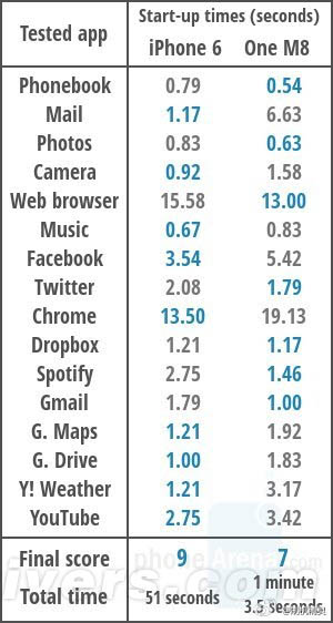 根据测试结果,iPhone 6共计耗时51秒;HTC One M8耗时1分零3.5秒,差距还是比较明显的。