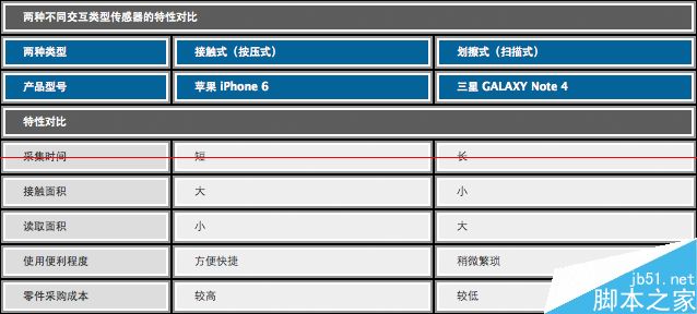 采集方式上,iPhone 6使用的是按压式的识别模块,Note 4采用的是划擦式的识别模块。按压式传感器的特点是接触面积大、识别效率高,但模块的尺寸也比较大,成本也较高。划擦式则刚好相反,虽然识别指纹效率低一些,但体积可以做小。