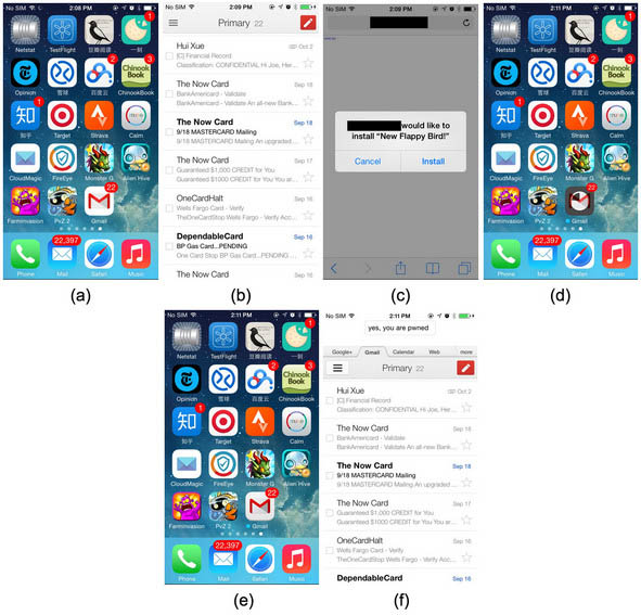 网络安全研究公司FireEye周一公布了iOS操作系统的一个应用安装验证漏洞。该公司称之为“面具攻击(Masque Attack)”。这一漏洞可以让黑客对iPhone和iPad的敏感数据进行访问或直接劫持这些设备并获得控制权。FireEye公司在其博客上公布了有关细节。为了实现“面具攻击(Masque Attack)”,黑客首先要向用户发送被感染的短信、电子邮件和网页链接,诱使其安装恶意应用程序。一旦恶意应用程序被安装后,就可以接管通过苹果应用商店安装的所有应用程序,包括电子邮件和银行应用。但是预装的应用,如Safari无法被更改。