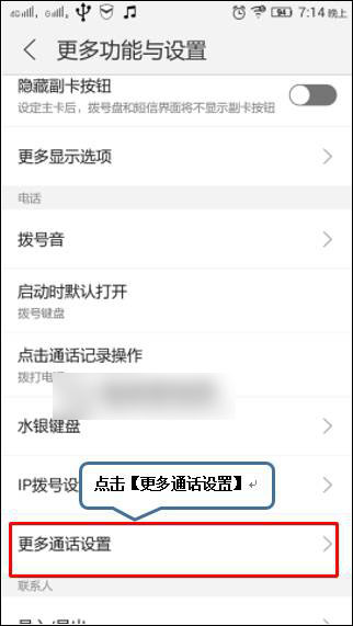 1、在手机待机的界面下,点击【电话】进入拨号界面,点击【菜单键】,然后点击【更多功能与设置】再点击【更多通话设置】,如下图;