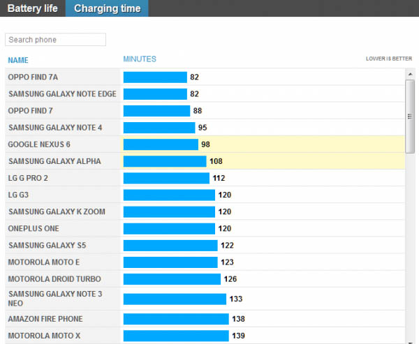 在完整充电时间上Nexus 6的充电效率也比较高,完整充电只需要98分钟,非常接近于Galaxy Note 4的95分钟。