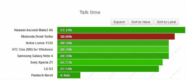 最终摩托罗拉Droid Turbo的续航能力被评为90小时,意味着用户如果每天拨打一小时电话、浏览一小时网页、观看一小时视频,那么它可以坚持三天多而不用充电。实际上,这个成绩在测试过的所有手机中排到了第四位,对于一部有着顶级硬件配置的Android旗舰来说,这个成绩是很不错了。