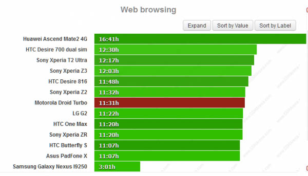 网页浏览测试中摩托罗拉Droid Turbo表现就不那么抢眼了,11个半小时的时间只能说很一般,这与它采用一块5.2英寸、2K分辨率屏幕是分不开的,这也说明就算采用的是比较省电的AMOLED屏幕,分辨率太高也会增加耗电量。