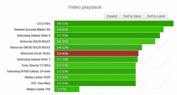 在视频播放测试中摩托罗拉Droid Turbo的表现也没有我们想象的那么好,13小时41分钟的时间远远落后于屏幕尺寸更大、电池容量更小的三星Galaxy Note 4(超过17小时),而且两者的屏幕分辨率还都是2K级别,这应该是跟系统优化有关。