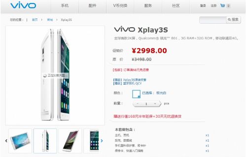 2K屏已经成为当今旗舰安卓手机的标配,那么对于全球第一款采用2K屏的手机Vivo Xplay3S更是意义重大,现在Vivo Xplay3S已经在官网降价,由原价3498元直降500元到2998元。
