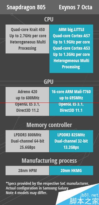 1.首先,我们来介绍下高通骁龙805和三星自家Exynos 7 Octa两款处理器的详细参数。