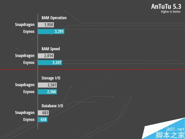 内存和数据库I/O测试:内存操作和速度上,Exynos 7 Octa领先,存储I/O测试持平,数据库I/O方面有微弱差距。