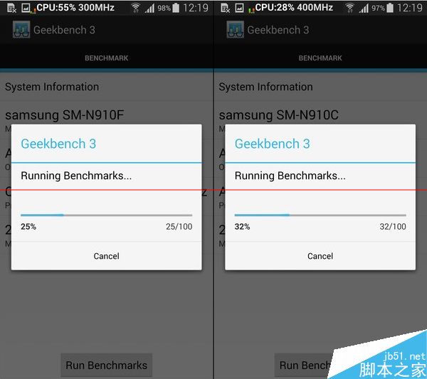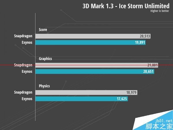 2.下面是分别基于骁龙805和Exynos 7 Octa的Galaxy Note 4的跑分结果: