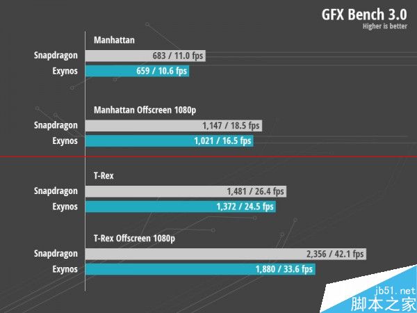 GFX Bench 3.0测试:高主频的骁龙805全面领先。
