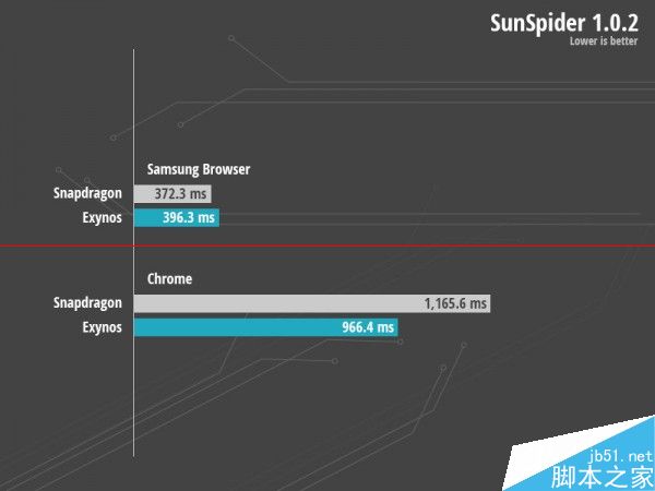 SunSpider 1.0.2测试(数字越低越好):三星自家浏览器的情况比较奇怪,骁龙805比Exynos 7 Octa平台的优化略好;但在Google Chrome上,Exynos 7 Octa又大幅领先于骁龙805平台。