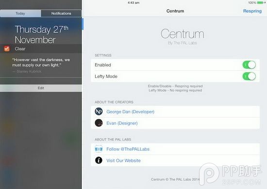 《Centrum》可以让iPad拥有OS X Yosemite式的通知中心,安装后想要打开通知中心的话你就需要从屏幕的两侧滑出,你也可以选择通知中心出现在屏幕的左边还是右边。你可以在设置应用里面的插件专属面板对插件进行设置,这里除了可以进行上述的设置外,你还可以打开或者关闭插件。【详情】