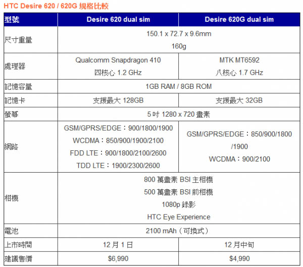HTC正式于台湾发布中低端双卡双待智能手机Desire 620/620G。其中Desire 620采用高通1.2GHz骁龙410四核64位处理器,网络制式支持4G+2G的双卡双待;Desire 620G则采用联发科MT6592 1.7Ghz八核处理器,网络则支持3G+2G的双卡双待模式。Desire 620于12月1日于台湾发售,售价6990新台币(约人民币1383元),而Desire 620G预期于12月中旬上市,售价仅4990新台币(约人民币987元)。