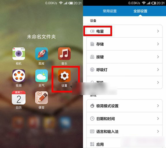 1,首先,进入红米Note增强版设置界面,切换到【全部设置】界面,找到【电量】图标,如下图所示: