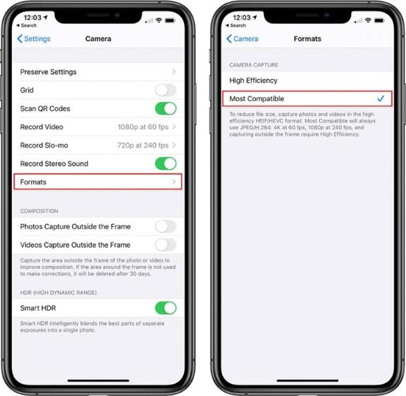 • 选择“最兼容”选项后,照片将始终保存为JPEG而不是HEIC文件格式。