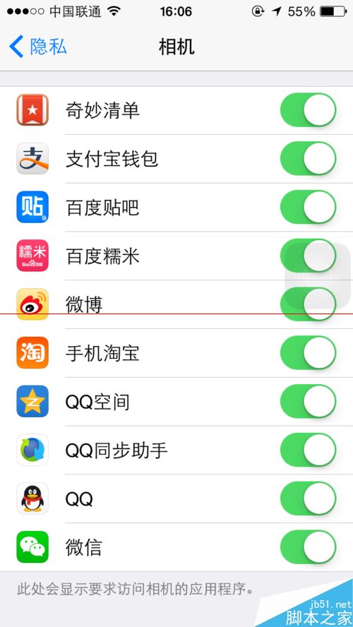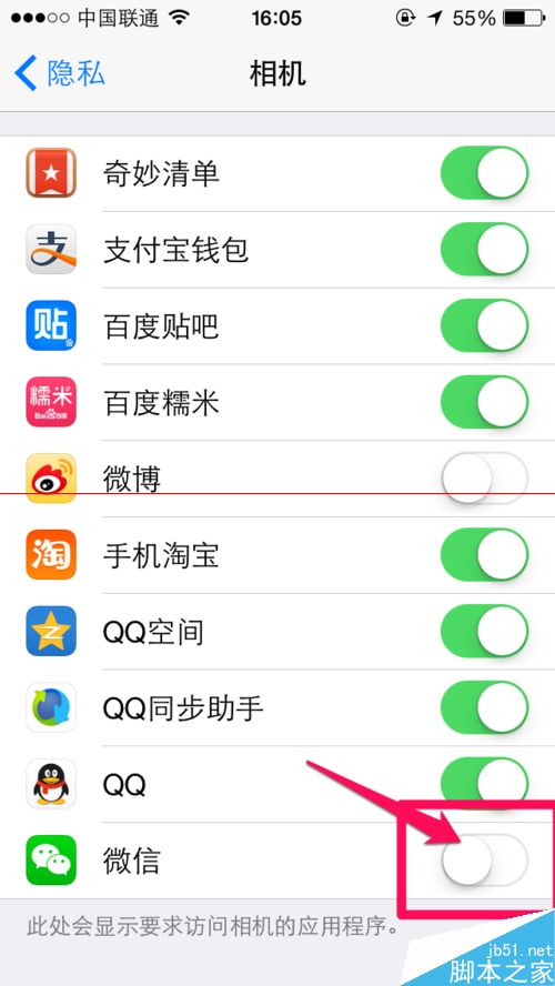4、把微信这个开关进行打开,允许微信等应用使用相机功能。