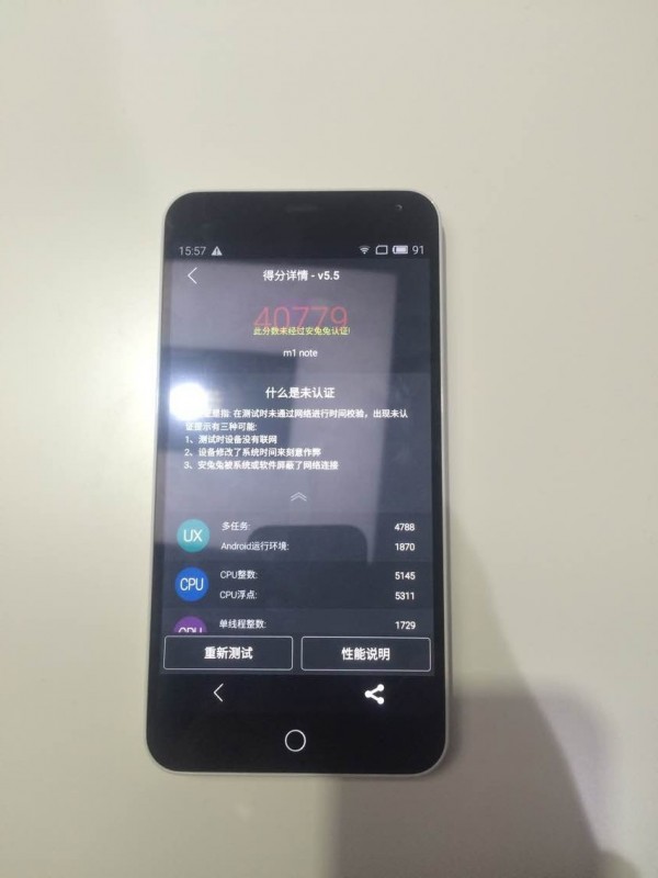 ▲魅蓝Note安兔兔跑分数为40779