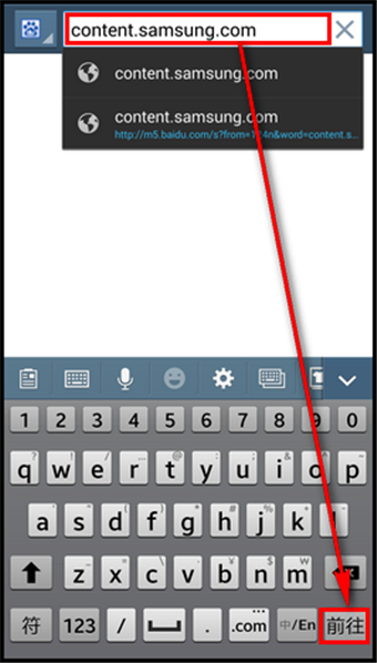 2.在打开的浏览器页面,输入网址“content.samsung.cn”,然后点击【前往】。