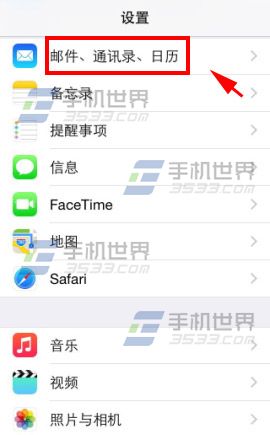 1)打开iphone5S【设置】点击【邮件、通讯录、日历】。(如下图)