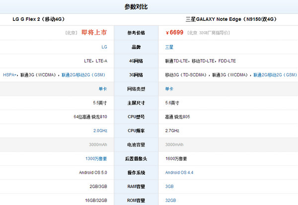 最后说一说价格,三星GALAXY Note Edge在国内的行货售价为6699元,个人认为还有降价的空间。它定价高昂的原因的除了因为生产曲面屏幕成本提高,更多的是对设计价值的一种体现。而对 于G Flex 2,虽然它的售价还未公布,但预计2GB内存版不会高于4000元,3GB版不会高于4500元,作为首款搭载骁龙810处理器的机型来说,选择它还是非常不错的。