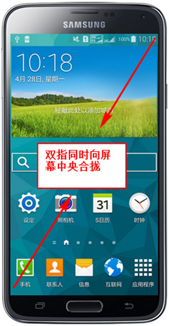 1.在主屏中向左或向右滑动屏幕选择您要添加小组件的屏幕,然后用两个手指以对角线方式向中间部位合拢。