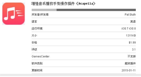 可以看出插件虽然比较简单,但是几乎囊括了用户日常生活中常用的所有操作,用户只需轻轻动动手指,就可以随心所欲的对音乐播放进行控制,而不需要解锁屏幕等复杂的操作。目前插件在Cydia当中售价1.99刀,对iOS 8系统已经完成了适配工作,用户都可以放心使用。