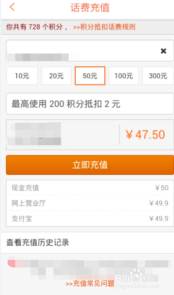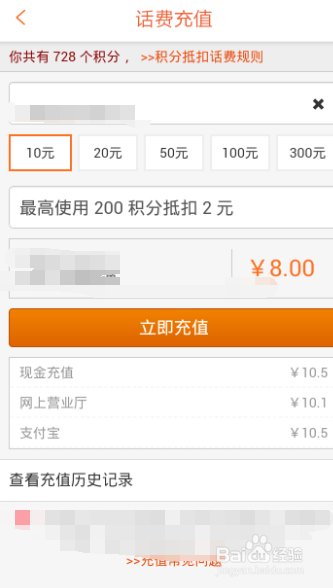 在这里大家可以看到我有700多积分,积分每天签到领取,可以看到10元的话费只需要支付8元,但是20元的就需要18.2元,50元的就需要47.5元。
