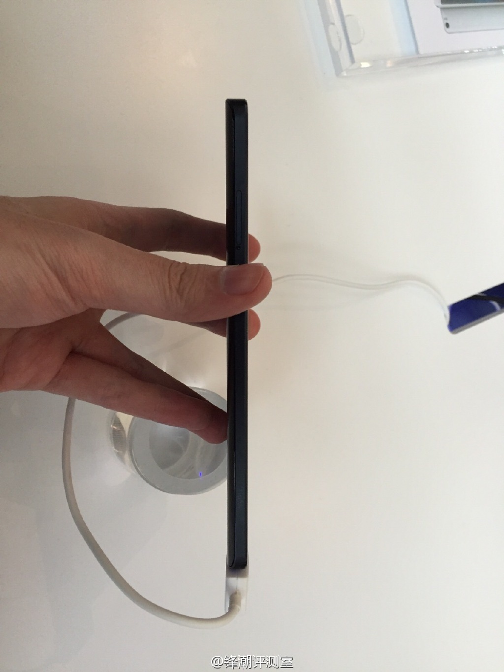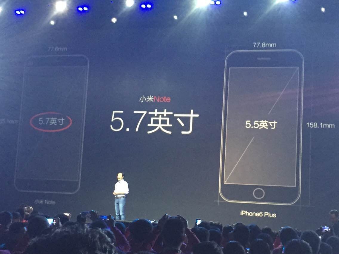 小米Note拥有5.7英寸显示屏,在机身规格方面相比iPhone 6 Plus更小一圈。小米Note厚度为6.95mm,重量约161克。雷军表示旗舰机型很少做超薄的,为了兼顾硬度、电池这两个重点,所以我们并没有把小米Note做薄。