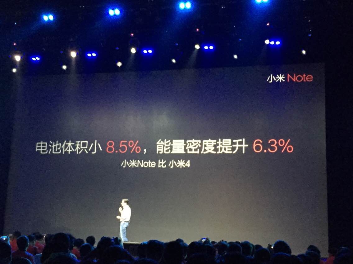 小米Note采用了4.4V高电压电池,内置3000mAh索尼/LG锂离子聚合物电池,相比小米手机4电池体积缩小8.5%,能量密度提升6.3%。