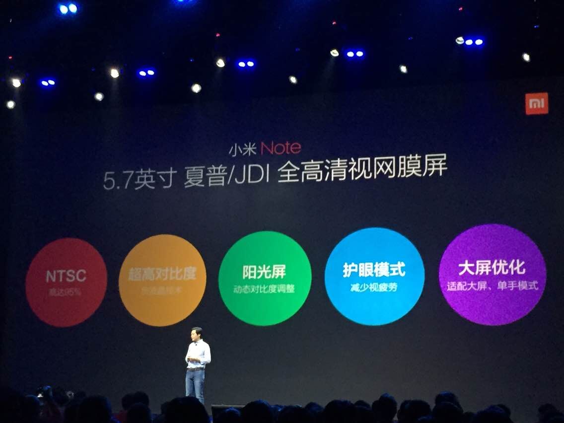 小米Note搭载一块5.7英寸大显示屏,分辨率为1920*1080,同为夏普/JDI提供,屏幕像素密度为386PPI,拥有95% NTSC高色彩饱和度,超越iPhone 6 Plus 30%。