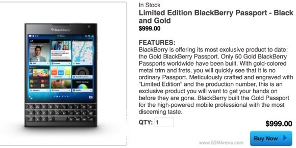 根据GSMArena的消息,一家名为ShopBlackBerry的加拿大网站页面出现了一款限量黄金版的黑莓Passport。该页面描述:黑莓提供的目前最独家产品,黄金版黑莓Passport,全球范围内目前仅有50部,带有黄金边框和装饰......设备上刻有“Limited Edition”字样以及生产编号......