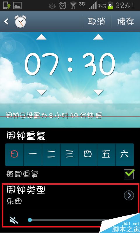 5、自己闹钟就得有声音啦,但是声音不要太大,尽量不要让自己吓醒,可以选择一些比较舒缓的音乐。