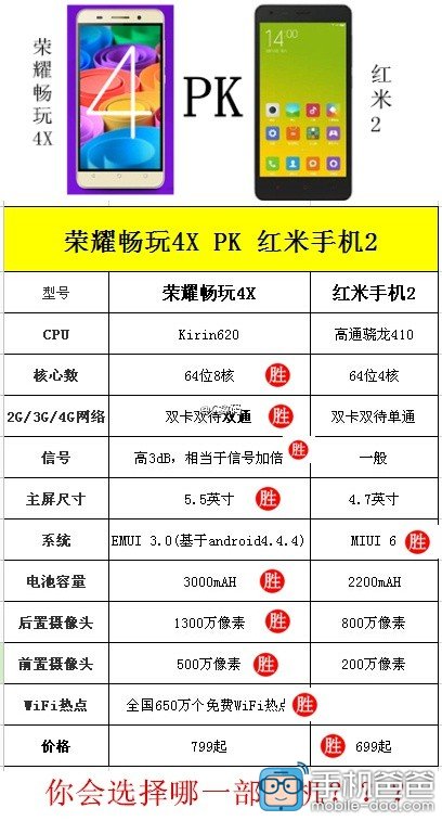 红米2刚一公布参数和价格,很多米粉都伤心了,红米2依然采用的早已被国产智能机用烂了的高通骁龙410处理器,因为骁龙410处理器的智能机,目前国产智能机已经有联想和酷派的智能机价格拉到599元,而荣耀畅玩4X则明智的采用了自家的麒麟620处理器。对于没有诚意的红米2,加100元的畅玩4X,你会选择哪款?红米2和荣耀畅玩4X哪个好呢?