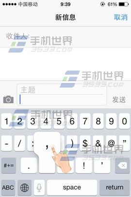 这里以iphone6信息为例,输入文字时如要输入标点符号我们只需按住【123】滑动手指至需要的标点即可。(如下图)