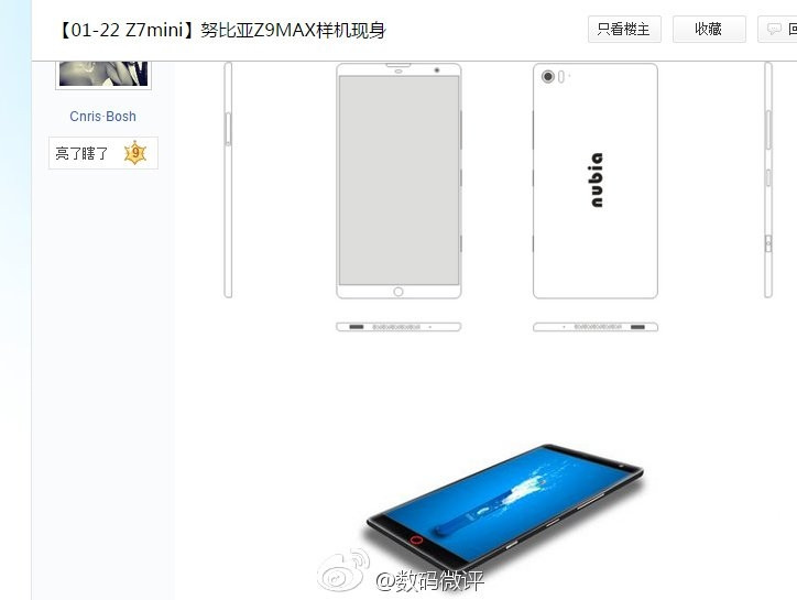从命名上来看,nubia Z9 Max应该也属于nubia Z9系列的大屏版本,屏幕尺寸应该在5.5英寸以上,有可能达到5.7英寸。此外nubia Z9 Max保留了nubia系列的小圆圈Home按键的设计。
