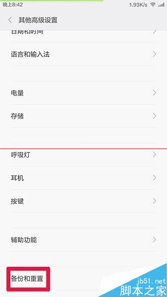 3、如下图,单击红框处 备份和重置