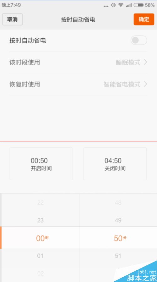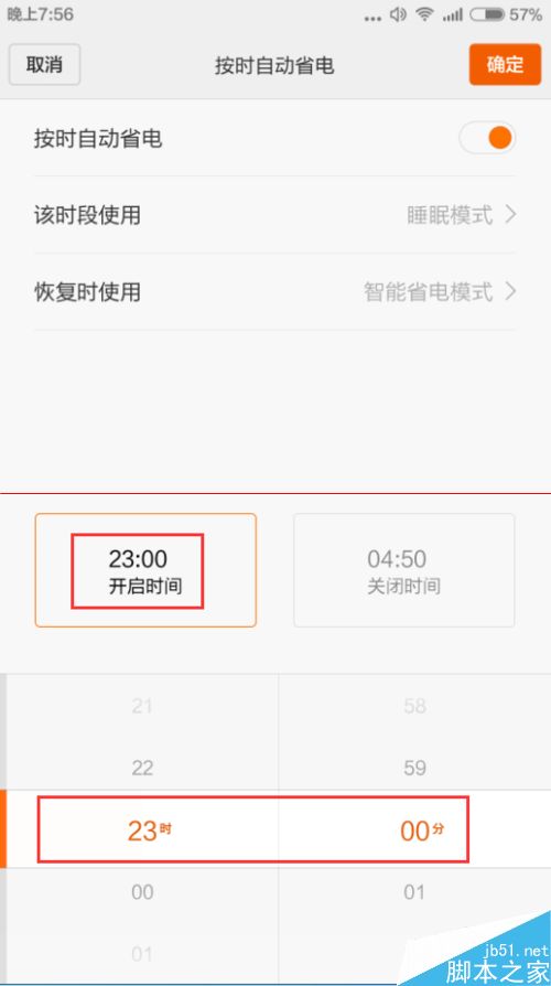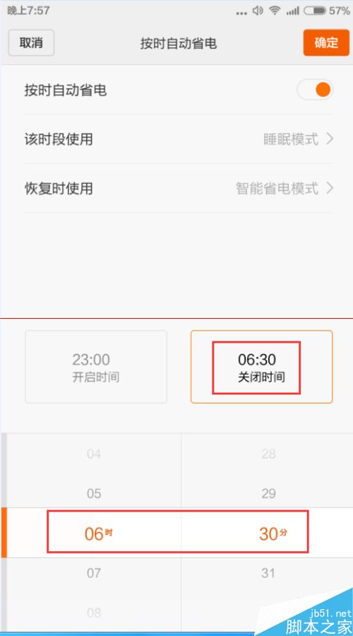 5、接下来我们设置自动省电的开启时间和关闭时间,设置开启时间为23:00,设置关闭时间为6:30,如图所示: