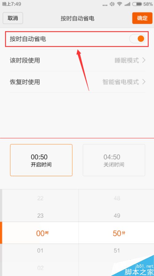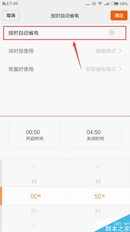4、默认情况下按时自动省电是关闭着的,点击开启,如图所示: