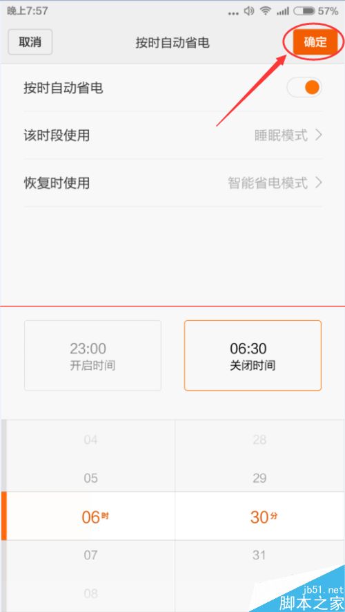 6、最后点击【确定】按钮完成设置,在手机电量界面就可以看到,手机将会从23:00到6:30自动切换为睡眠模式,如图所示: