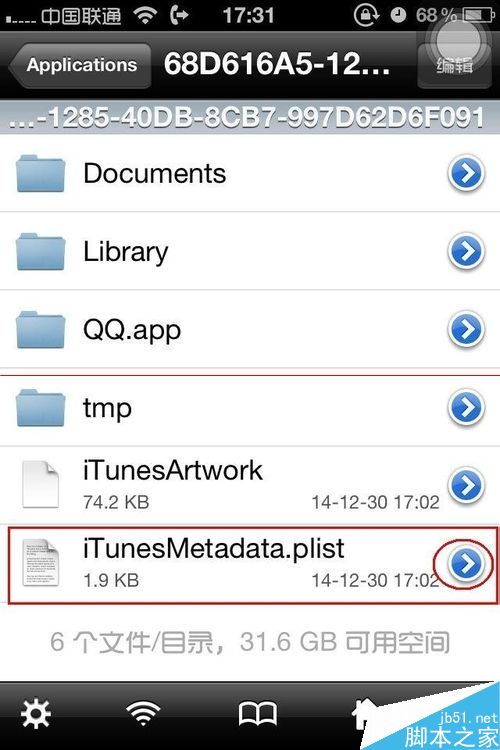 3、QQ文件夹下面会看到iTunesMetadata.plist,按右侧的">"。