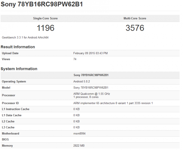尽管索尼并不打算下月在西班牙巴塞罗那举行的MWC 2015大会,但关于Xperia Z4的相关信息已经提前曝光。在昨天上传至GeekBench跑分库中证实该机将会装备高通骁龙810处理器(MSM8994),并运行Android 5.0.2 Lollipop系统。