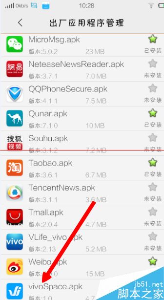 5、进去“出厂应用程序管理”后,找到”vivoSpace.apk“,然后安装该软件,安装成功后就可以使用动态壁纸了!