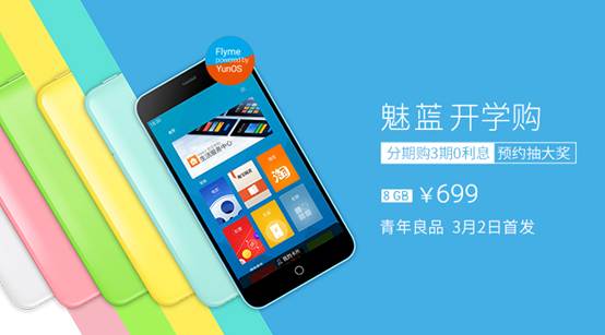 2月25日起,魅蓝(Flyme powered by YunOS)在魅族天猫官方旗舰店开放预约,并将于3月2日上午10:00正式对预约用户开放购买,售价为8G版本 699元,支持天猫分期购3期0利息。魅蓝手机采用与iPhone 5C一致的聚碳酸酯材质一体化成型工艺,6 种定制的原料本色(绿、蓝、黄、粉、白和粉蓝色),使得魅蓝手机外观绚丽,且拥有出色的握感。