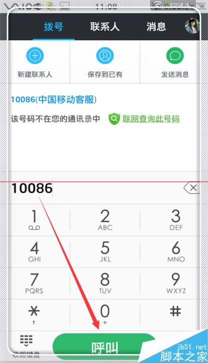 2、然后在拨号中输入10086,之所以输入这个,是为了避免打扰自己的朋友,用10086来验证(对方是机器,没什么打扰)。然后点击“呼叫”。