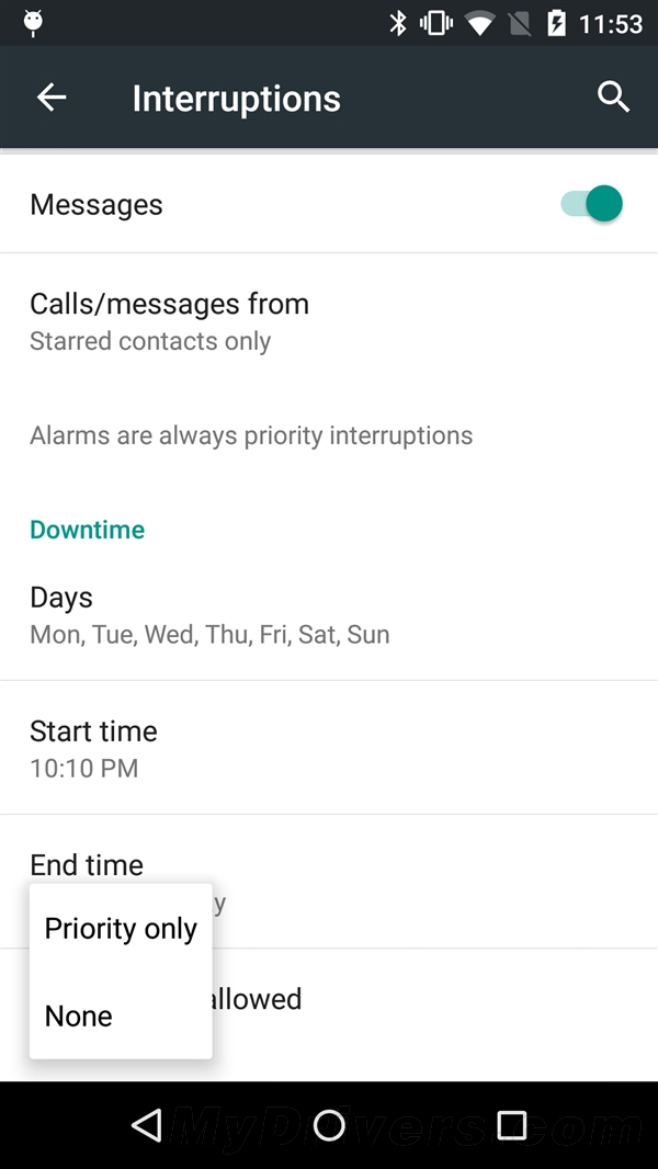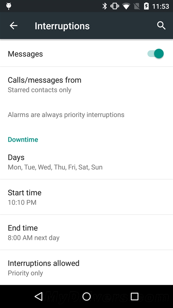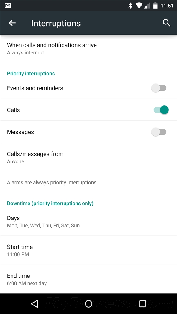 现在,安卓5.1进一步增强了该模式,可以屏蔽任何通知了。在设置-声音与通知-免打扰菜单里(也可以点击音量调节提示框的齿轮图标进入),滚动到底部,你就可以设置在免打扰模式中,是只允许高优先级通知,还是拦截所有通知