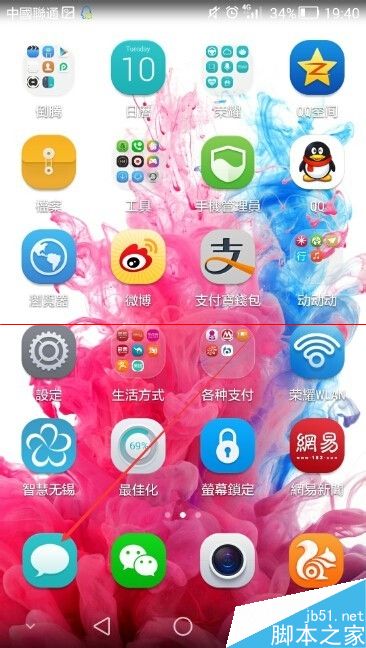 1、打开华为荣耀6手机后,进入荣耀6主界面,点击桌面上的短信图标,如下图所示。